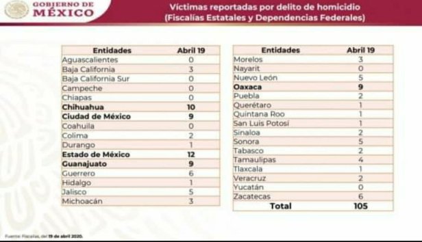 El domingo 19 de abril fue el día más violento del 2020, con 105 víctimas de homicidio doloso en el país, la mayoría en el Estado de México, con 12, según el reporte del conteo diario del gobierno federal.