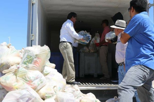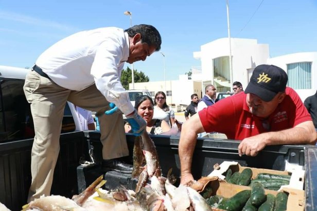 El alcalde agradece la participación y donación de las cooperativas de Bahía Tortugas Emancipación, La Purísima, Buzos y Pescadores, así como la cooperativa Leyes de Reforma, ya que hicieron posible trasladar el producto a la Delegación de Vizcaíno como centro para ser repartido fraternalmente.