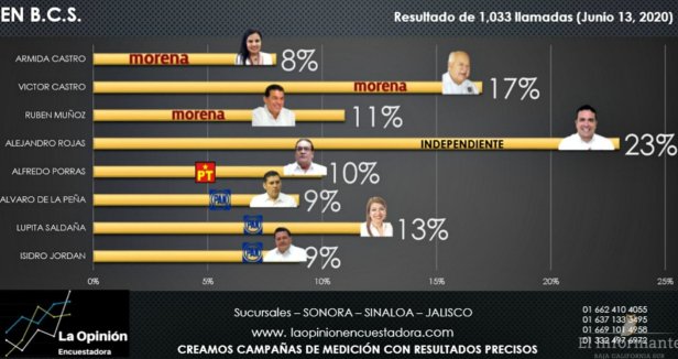 En esta medición, correspondiente al 13 de junio, Rojas Tirado recibió el apoyo del 23 por ciento de los encuestados mientras que el 17 por ciento considera viable que Castro Cosío fuera el gobernador de Baja California Sur (BCS).