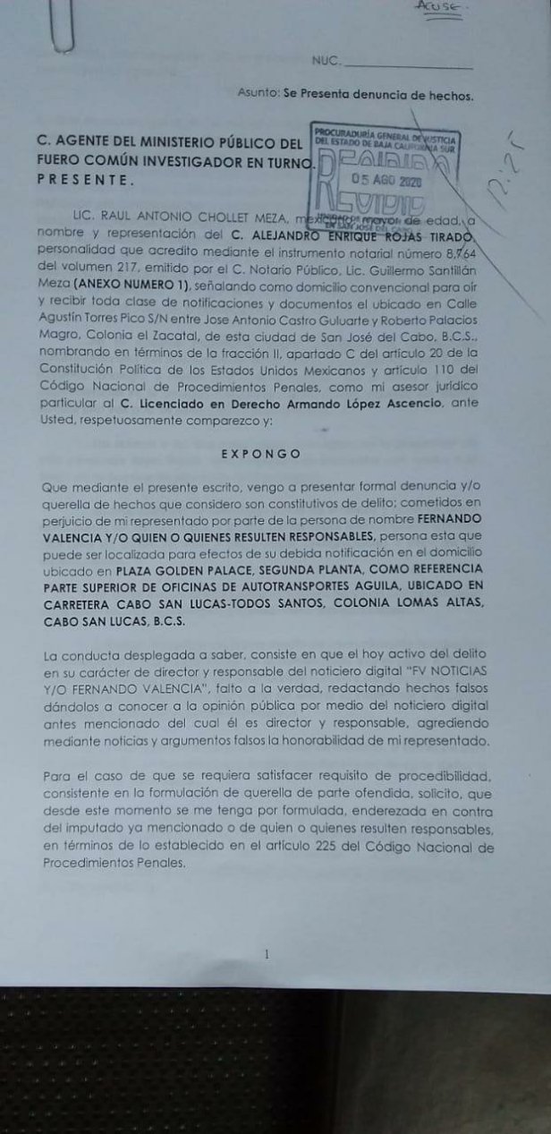 El dia de ayer 05 de agosto de 2020 se interpuso denuncia y/o querella en contra del C. Fernando Valencia por su probable participacion en hechos constitutivos de delito, toda vez que este en su caracter de director o responsable del noticiero digital FV Noticias, falto a la verdad, publicando hechos dolosos, carentes de todo sustento, con la unica intencion de provocar descredito social del C. ALEJANDRO ROJAS TIRADO, agrediendo con ello su honorabilidad.