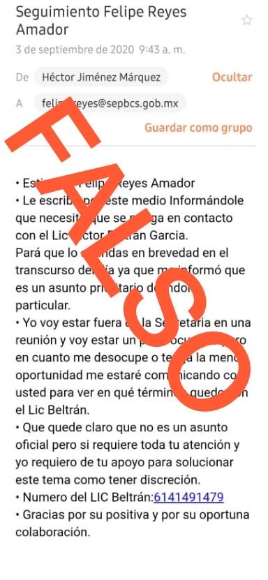 Jiménez Márquez enfatizó que la cuenta de correo electrónico falsa detectada es secretario_sepbcs@outlook.com desde la cual se han estado enviado diversas instrucciones a su nombre, por lo que exhortó a reportar esta acción y no atender las indicaciones, ni hacer contacto con los números telefónicos que en el mismo correo se envían.