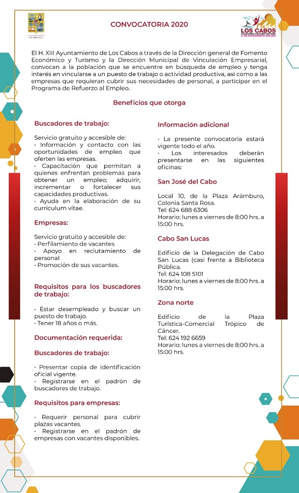 Los interesados pueden presentarse a las oficinas de Fomento Económico y Turismo, en el local 10 de la Plaza Arámburo, en la colonia Santa rosa de San José del Cabo, de 8:00 de la mañana a 3:00 de la tarde, siguiendo las medidas de higiene y sana distancia.