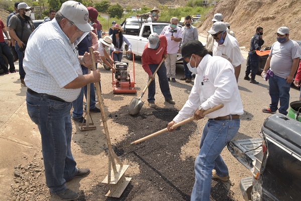 Con la participación del alcalde, regidores, funcionarios, el grupo de jóvenes “Los 300”, y ciudadanos dio inicio la campaña de bacheo en tramo de la carretera transpeninsular, acceso sur a Santa Rosalía.
