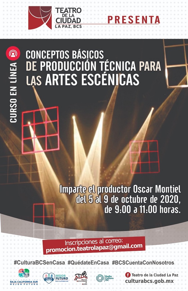 El Director del Instituto Sudcaliforniano de Cultura (ISC) Christopher Amador Cervantes, dio a conocer que gracias al Gobierno del Estado a través del Teatro de las Ciudad de La Paz se estará llevando a cabo el taller “Conceptos Básicos de Producción Técnica para las Artes Escénicas”, el cual dará inicio el lunes 5 de octubre de 09:00 a 11:00 horas por plataforma Zoom.