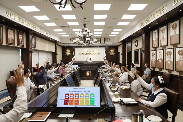 Al presidir la sesión del Comité, junto con el secretario de Salud, Víctor George Flores, y de los representantes del sector y de los ayuntamientos de la Entidad, el ejecutivo estatal recordó que, con la apertura de más actividades económico-sociales se multiplican las posibilidades de adquirir la enfermedad, por lo que se hace indispensable fortalecer el autocuidado, debido a que el peligro no ha pasado.