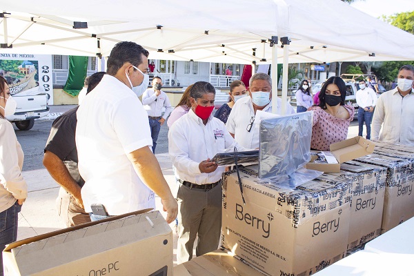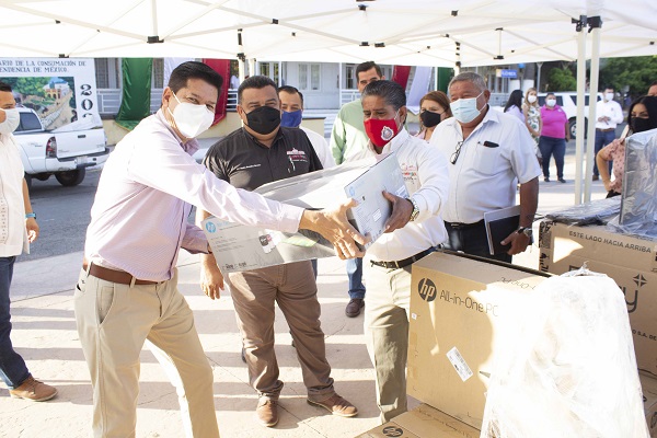 Esta mañana, durante la ceremonia de honores a la Bandera celebrada frente al palacio municipal, el alcalde José Felipe Prado Bautista, acompañado de funcionarios y regidores, hizo entrega de 26 equipos de cómputo y 4 multifuncionales que serán distribuidos principalmente en las áreas de Catastro y Recaudación de las distintas delegaciones del municipio de Mulegé.