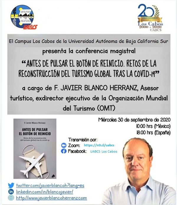 En el marco del Día Mundial del Turismo, este 30 de septiembre la Universidad Autónoma de Baja California Sur, Extensión Académica Los Cabos, celebrará una conferencia abierta a todo público, a cargo de Javier Blanco Herranz, ex director ejecutivo de la Organización Mundial del Turismo.