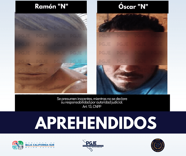 La Procuraduría General de Justicia del Estado (PGJE) en Coordinación con la Guardia Estatal de Seguridad e Investigación del Estado de Baja California (GESI), aseguró a Ramón Adalid ¨N¨ de apodo ¨La Nina¨ y Oscar ¨N¨ de apodo ¨El Gordo¨, quienes fueron detenidos en la ciudad de Tijuana, tras contar con un mandamiento por el delito de homicidio, en agravio de una persona del sexo masculino.
