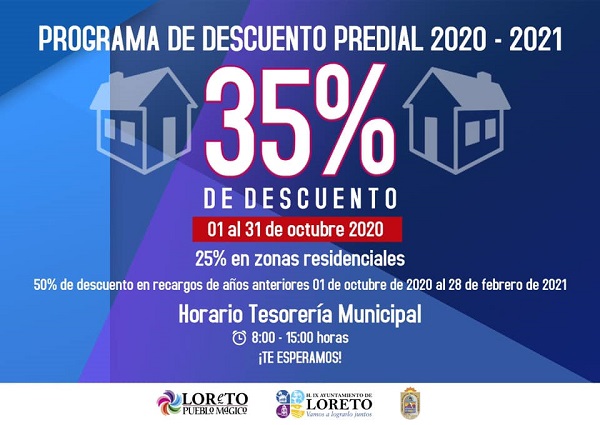 El H. IX Ayuntamiento de Loreto invita a todos los contribuyentes municipales a que aprovechen los días de subsidio (descuento), en el pago de los impuestos prediales durante este mes de octubre, donde se ofrece un 35% menos en zona habitacionales y comerciales y un 25% en zonas residenciales a quienes paguen por adelantado el ejercicio 2021.