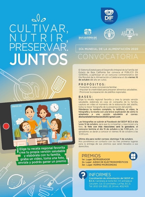 La directora destacó que quienes participen deben enviar el video, una fotografía y la receta con una breve explicación de cómo fue adaptada a esta nueva versión sana, con su nombre completo y teléfono al correo diamundialalimentacion2020@gmail.com, puntualizando que dichas fotografías se subirán a la plataforma de facebook de SEDIF BCS, el día lunes 12 de octubre, dando un tiempo que terminará el día 15 del mismo mes a las 23:59 horas, para que compartan y reaccionen a la fotografía, de las cuales las tres primeras que obtengan más reacciones serán las ganadoras de atractivos premios.