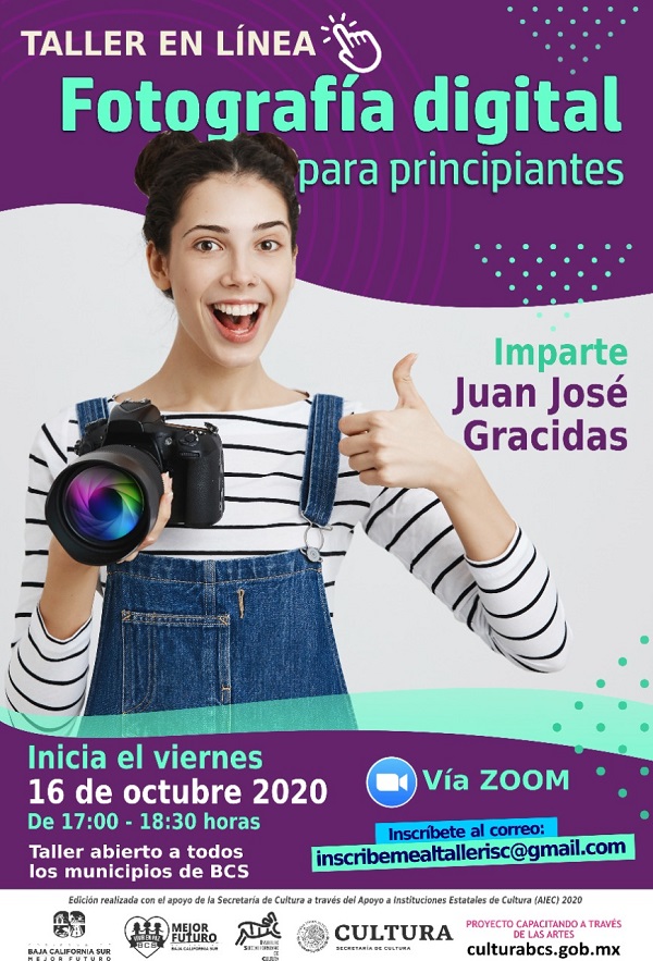 La Secretaría de Cultura través del Instituto Sudcaliforniano de Cultura (ISC) da a conocer que el próximo viernes 16 de octubre estará dando inicio el taller de fotografía digital para principiantes, el cual será impartido por Juan José Gracidas, informó el titular de Cultura en la entidad Christopher Amador Cervantes.
