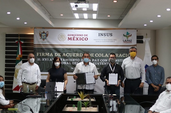 Con la finalidad de dar debido seguimiento al proceso para apoyar a 161 familias de la colonia Calafia, en la escrituración de los predios donde habitan, este miércoles se llevó a cabo la firma del convenio de adhesión para la Ejecución de Acciones Dentro del Programa de Mejoramiento Urbano (PMU) que lleva el Instituto Nacional de Suelo Sustentable (INSUS), con la colaboración del XVI Ayuntamiento de La Paz.