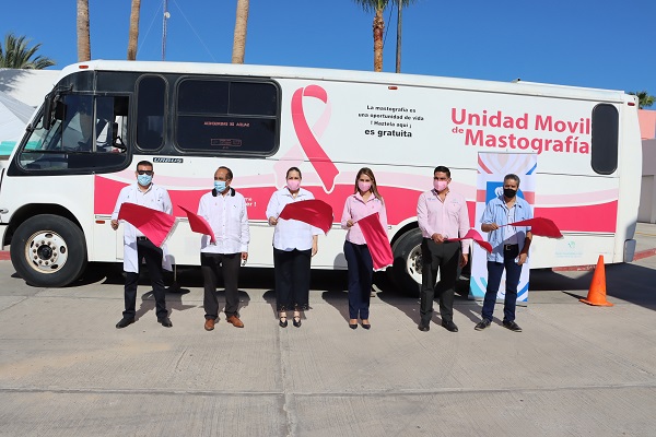 Con el propósito de contribuir a la concientización sobre la importancia de la detección temprana del cáncer de mama, la presidenta honoraria del Sistema Estatal DIF (SEDIF) Gabriela Velázquez de Mendoza, acompañada por el secretario de salud en el estado, Víctor George Flores, encabezó el banderazo de arranque de la jornada de trabajo del mastógrafo móvil, el cual se llevó a cabo en el estacionamiento del Centro de Rehabilitación y Educación Especial (CREE).