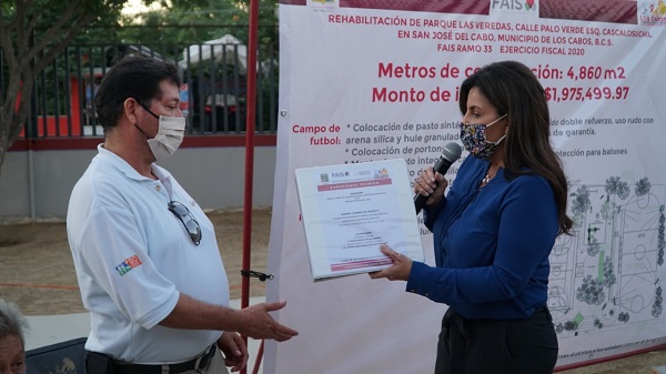 Para beneficio de más de mil 800 ciudadanos, la presidenta municipal de Los Cabos, Armida Castro Guzmán, encabezó el banderazo de inicio de la rehabilitación del parque “Las Veredas”, ubicado en la calle Palo Verde esquina con Cascalosuchil, en la colonia del mismo nombre en la cabecera municipal; dichos trabajos representan una inversión de $1 millón 975 mil 499.98 pesos del FAIS Ramo 33 ejercicio fiscal 2020, gestionados por la alcaldesa Armida Castro Guzmán ante el Gobierno Federal.