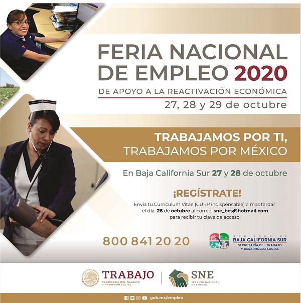 La Secretaría del Trabajo y Desarrollo Social (STDS), por medio del Servicio Nacional de Empleo en la entidad (SNEBCS), llevará a cabo la “Feria de Empleo de Apoyo para la Recuperación Económica”, a realizarse de manera virtual los días 27 y 28 de octubre, para dar respuesta a la creciente demanda de personal por parte de las empresas que han reanudado sus operaciones, así como de mujeres y hombres que están buscando una oportunidad laboral, informó Gustavo Hernández Vela, titular de la dependencia estatal.