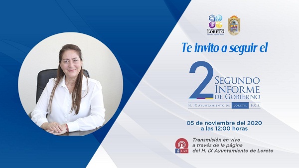 La Presidenta Loretana, Arely Arce Peralta, invita a su segundo informe de gobierno, el cual se llevará a cabo este jueves 05 de noviembre del presente año, en punto de las 12:00 horas, en la Sala de Cabildo “José María Mata”, y que será transmitido de forma virtual en la página oficial de la novena administración https://www.facebook.com/IXAyuntamientoLoreto