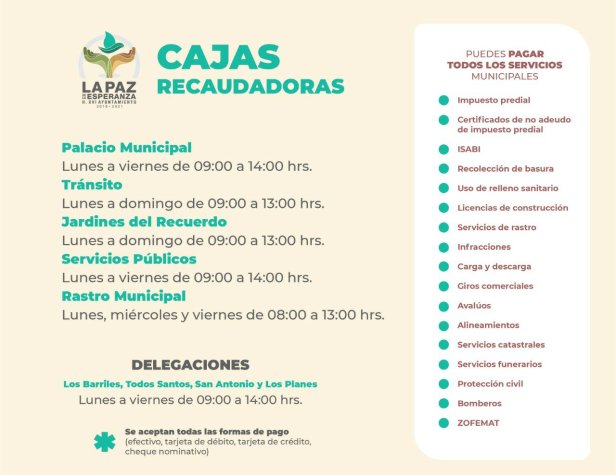 Para mayor comodidad de los contribuyentes, además de las cajas recaudadoras ubicadas en Palacio Municipal, también están disponibles las cajas recaudadoras en Tránsito Municipal, Rastro Municipal, Jardines del Recuerdo, Dirección de Servicios Públicos Municipales, OOMSAPAS La Paz y Mercado Olachea.