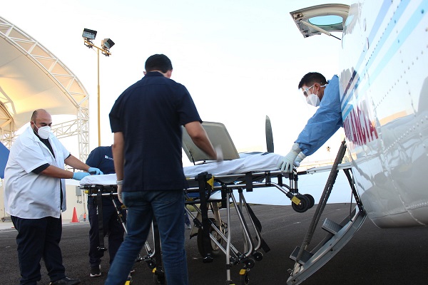 Este vehículo que mantiene su funcionamiento en esta pandemia, equipado con material para proteger de contagios por COVID-19 tanto a la tripulación y los trabajadores de salud que efectúan los traslados, como a los pacientes, lo que ha permitido realizar el desplazamiento de personas que enfrentan una emergencia de gravedad y que están en condiciones estables para volar y ser llevadas a centros hospitalarios que cuenten con unidades intensivas.