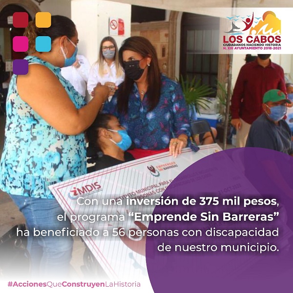A fin de incentivar a las familias de personas con discapacidad para que puedan emprender alguna actividad económica, el Gobierno de Los Cabos, a través del Instituto Municipal para el Desarrollo e Inclusión de Personas con Discapacidad (IMDIS), ha beneficiado -durante este 2020-, a través del programa “Emprender sin Barreras”, a 56 personas con una inversión de $375 mil pesos.