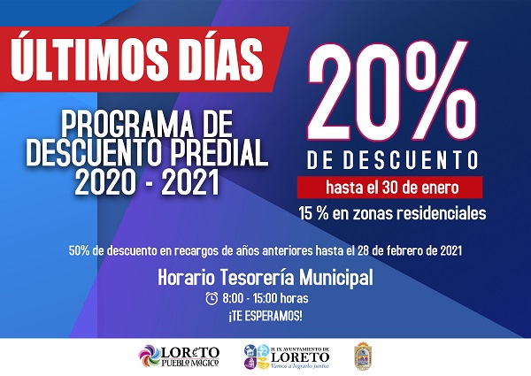El Secretario de Finanzas y Administración de Loreto, Loreto Arce Davis, informó que está por cumplirse el plazo del programa de descuento al impuesto predial que contempla, aplicar a todos los contribuyentes municipales, el 20% en zonas habitacionales y un 15% en zonas residenciales sobre sus pagos por adelantado del impuesto predial del ejercicio 2021.