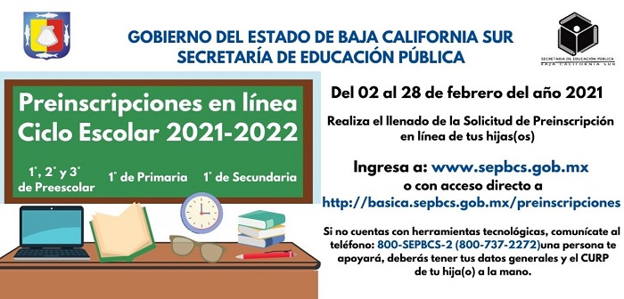 A partir de este martes dos de febrero la Secretaría de Educación Pública de Baja California Sur, a través de una plataforma digital disponible en el portal http://www.sepbcs.gob.mx, inicia por primera vez en la historia de la entidad el proceso de preinscripciones en línea para el ingreso a preescolar, primaria y secundaria ciclo escolar 2021-2022, informó el titular de la SEP en la entidad, Gustavo Cruz Chávez.