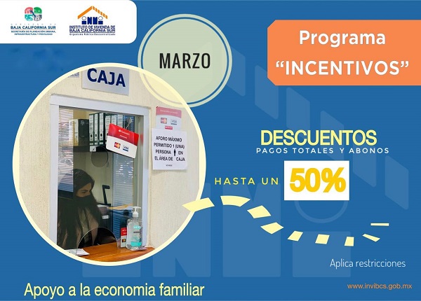 El Gobierno del Estado a través de la Secretaría de Planeación Urbana, Infraestructura y Movilidad (SEPUIM), arrancó este mes de marzo el Programa de Incentivos para las y los beneficiarios de los diversos programas que ofrece el Instituto de Vivienda (INVI) en Baja California Sur, así lo informó la directora general del organismo, Rosalva Cuadras López.