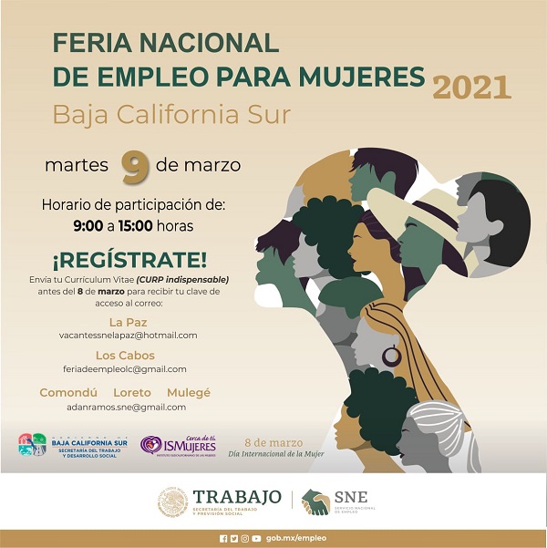Todo se encuentra listo para la realización de la primera Feria Nacional de Empleo en Baja California Sur, la cual se efectuará de manera virtual en el marco conmemorativo del Día Internacional de la Mujer, el próximo 9 de marzo, así lo informó Tomás Flores Gameros, secretario del Trabajo y Desarrollo Social.