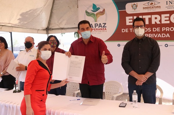 Gracias al convenio celebrado entre el XVI Ayuntamiento de La Paz y el Instituto Nacional del Suelo Sustentable (INSUS), mediante el programa municipal “Papelito Habla” y el programa federal de mejoramiento urbano en sus diferentes vertientes, la mañana de este viernes se realizaron dos eventos para la entrega de títulos de propiedad a 250 familias que habitan en 5 colonias de La Paz, mismas que carecían hasta hoy, de la certeza jurídica de la tierra donde están sus hogares.