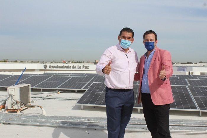 El Secretario General de la Agencia Ambiental Internacional CC35, Sebastián Fernández, visitó y supervisó las instalaciones en el Palacio Municipal donde se hace uso de la energía renovable, recorrido en el que estuvo acompañado por el Presidente Municipal, Rubén Muñoz, quien le mostró las diferentes acciones que se vienen realizando en materia ambiental en La Paz.