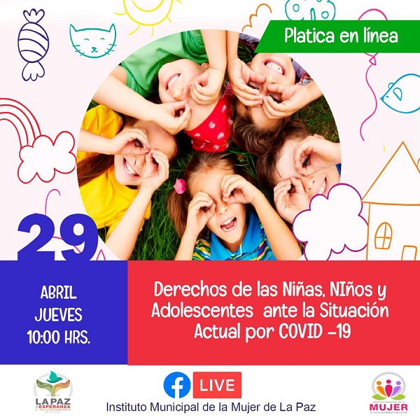 El Instituto Municipal de la Mujer (IMMujer) de La Paz invita a la población a la plática en línea denominada “Derechos de las Niñas, Niños y Adolescentes” ante la situación actual por el Covid-19, la cual se transmitirá a través de su página de Facebook en vivo este jueves 29 de abril a las 10 de la mañana, en el marco de la celebración del “Día del Niño”.
