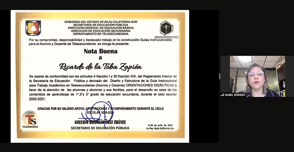 Como parte de las actividades del cierre del periodo escolar 2020-2021, la Secretaría de Educación Pública del Estado otorgó notas buenas a 36 maestras, maestros, directores, asesores técnico pedagógicos y supervisores de telesecundaria, que participaron en la elaboración de guías instruccionales para estudiantes de esta modalidad educativa y que fortalecieron la enseñanza a distancia, informó la titular del área, Isabel Romero Aguilar.