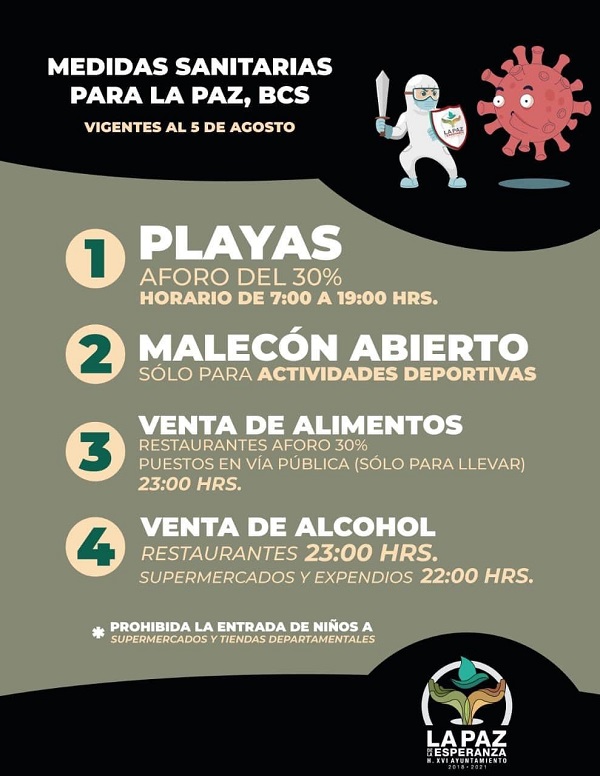 En sesión efectuada la tarde de hoy en la Sala de Cabildo por los integrantes del Comité Municipal de Salud de La Paz, se acordó que sigan vigentes las medidas sanitarias implementadas para el municipio, mismas que se estarán aplicando del 29 de julio al 05 de agosto, con la finalidad de disminuir los contagios por Covid-19.