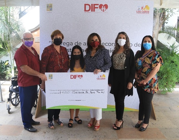 La alcaldesa de Los Cabos Armida Castro Guzmán hizo entrega de un apoyo económico de $70 mil pesos a la fundación Cabo Carolina A.C., encabezada por Lizbeth Carolina Bouchard Jiménez, para la adquisición de material que complementará los equipos para la rehabilitación de personas con discapacidad motriz.