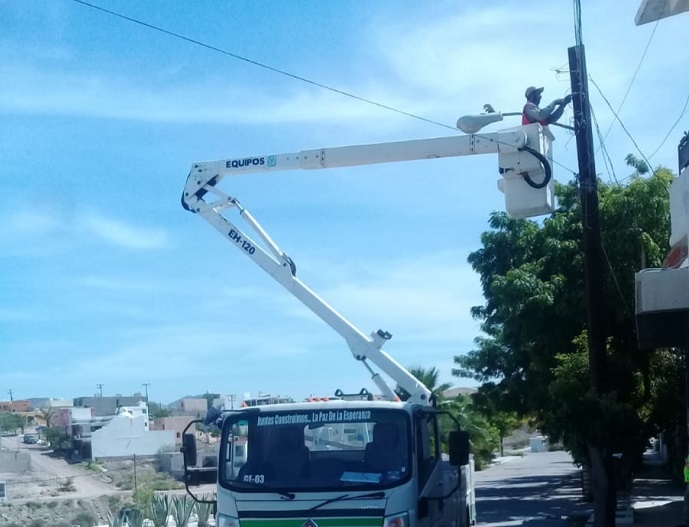 Para mejorar las condiciones del alumbrado público en las Delegaciones y Subdelegaciones de La Paz, trabajan activamente los equipos de la Dirección General de Servicios Públicos Municipales, cuyo objetivo primordial es también acercar los servicios de esta dependencia municipal a la zona rural.