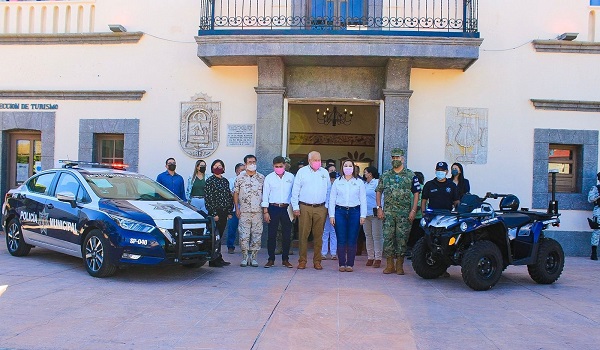 En compañía del secretario general de gobierno, Homero Davis Castro, el mandatario sudcaliforniano destacó que ello contribuirá a las labores que realiza la Dirección de Seguridad Pública Municipal, unidades consistentes en una patrulla y una cuatrimoto, adquiridas dentro del programa de prioridad nacional “Equipamiento de las Instituciones de Seguridad Pública” del Fondo de Aportaciones (FASP) 2021, con una inversión de $591,586.12 pesos.