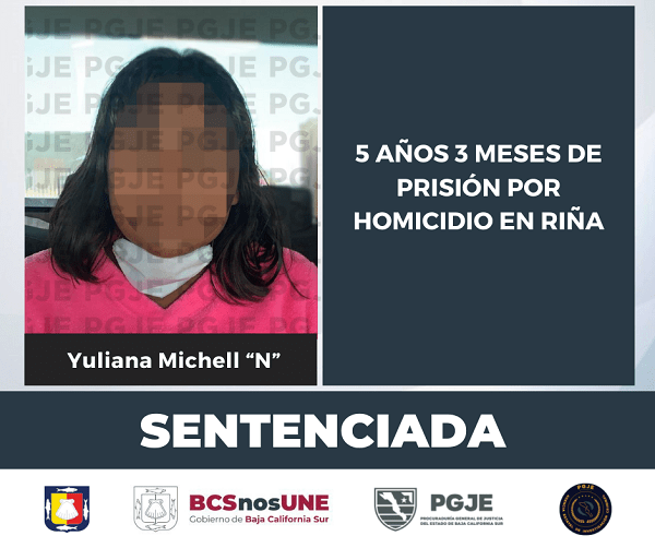 Luego de presentar los datos de prueba necesarios y suficientes, la Procuraduría General de Justicia del Estado (PGJE) acreditó la responsabilidad de una mujer identificada como Yuliana Michel “N” por el delito de homicidio en riña, en agravio de quien en vida llevara el nombre de Alejandro “N”, por el que un juez de Control, mediante Procedimiento Abreviado, impuso una sentencia de 5 años 3 meses de prisión y un pago por reparación del daño por 616 mil 100 pesos.