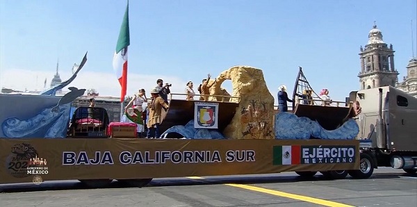 El contingente de Baja California Sur, encabezado por el titular de Cultura Víctor Hugo Caballero Gutiérrez, el actor sudcaliforniano Enoc Leaño, la actriz Idalia Figueroa, así como integrantes de ballet Folclórico del Gobierno del Estado, abordaron dicho carro alegórico, que contenía diversos elementos que mostraban la belleza histórica y cultural de la península.