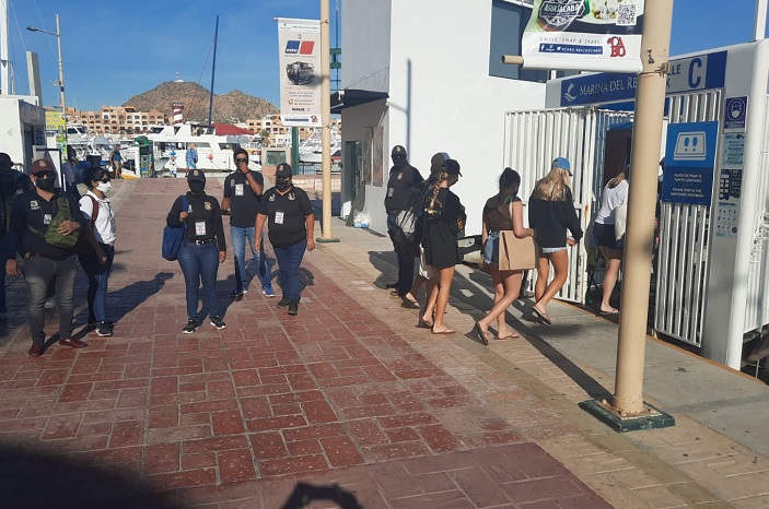 Con la finalidad de fortalecer las estrategias de control de contagios de COVID-19 y ante la llegada de tres cruceros, personal de Inspección Fiscal desplegó un operativo en La Marina de Cabo San Lucas, verificando que todos los turistas cumplan con las medidas establecidas por el Consejo Estatal de Seguridad en Salud.