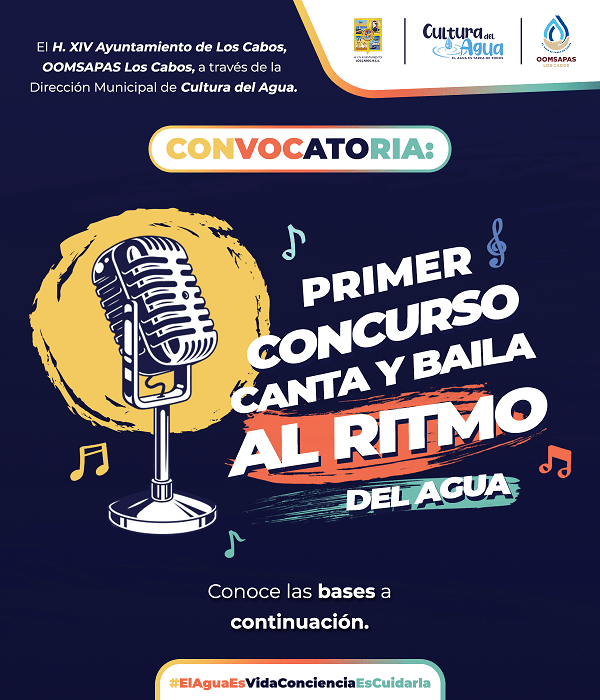 A la ciudadanía de Los Cabos se le invita a participar en el primer concurso denominado “Baila y Canta al Ritmo del Agua”, que promueve la Dirección Municipal de Cultura del Agua del Oomsapaslc; los temas principales de la composición son: el cuidado del agua y el agua es tarea de todos.