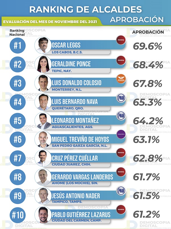 Luego de que el pasado mes de octubre, a través de una encuesta de Demoscopia Digital en la red de mensajería instantánea WhatsApp Messenger, un estudio de opinión pública colocó al presidente municipal de Los Cabos, Oscar Leggs Castro, como el 2do alcalde mejor evaluado; en sus resultados de noviembre, -con un 69.6% de aprobación ciudadana-, se posicionó como el mejor alcalde de México.