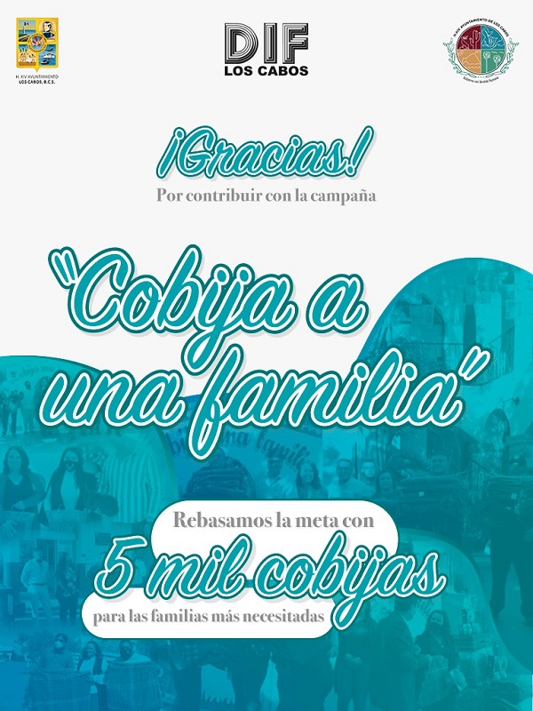 En esta ocasión, el 10 de noviembre se dio arranque a la campaña “Cobija a una Familia”, teniendo una meta ambiciosa con la recaudación de 2 mil cobijas nuevas; no obstante, por mucho se superó la meta, por lo que en esta ocasión la dinámica para repartir las cobijas se estará anunciando por medio de la página de Facebook: DIF Los Cabos y a través de los medios de comunicación.