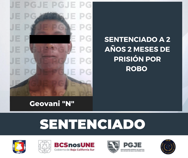 La Procuraduría General de Justicia del Estado (PGJE) de Baja California Sur obtuvo de un juez de control sentencia de 2 años 2 meses de prisión y un día de multa – mediante procedimiento abreviado – contra un individuo identificado como Geovani “N”, que cometió robo de bienes en el municipio de Los Cabos.