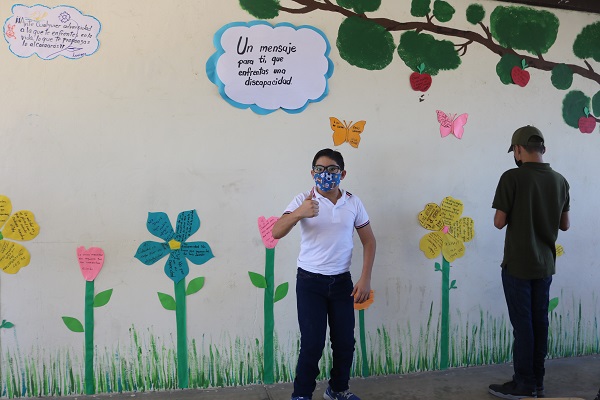 Al respecto, la docente mencionó que, a fin de sensibilizar a las alumnas y alumnos sobre el tema de incluir en el ambiente escolar a las y los adolescentes con alguna discapacidad, se diseñó el mural denominado Un Mensaje para Ti, integrado con ideas alusivas a la celebración del Día Internacional de las Personas con Discapacidad.