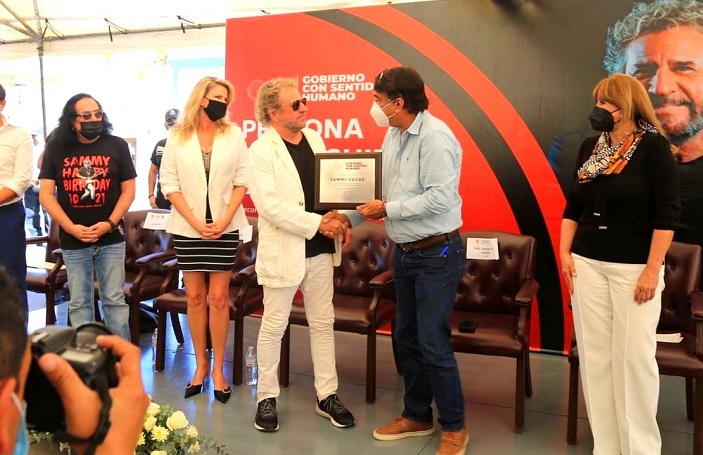En el marco de la celebración del programa denominado “Persona Distinguida de Los Cabos”, -celebrado en la explanada de la plaza José Antonio Mijares, ubicada en la cabecera municipal-, el alcalde Oscar Leggs Castro entregó un reconocimiento al fundador de Cabo Wabo, Sammy Hagar, guitarrista de conocida banda de rock de los 70´s, quien desde hace años ha contribuido al crecimiento y la promoción del destino turístico a nivel mundial.