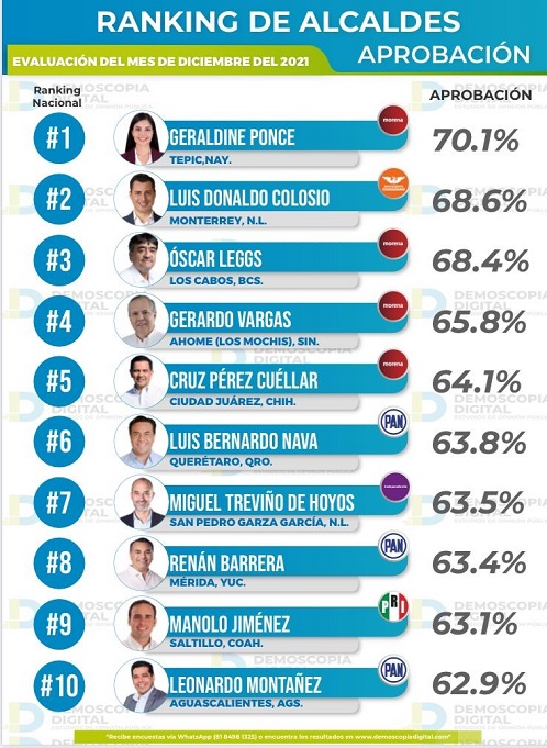 - Esta aceptación se registra en una puntuación de 125 alcaldes que son evaluados de manera mensual.