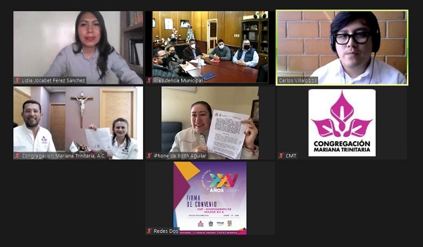 Edith Aguilar Villavicencio encabezó un encuentro virtual donde se llevó a cabo la firma de un convenio marco de colaboración entre el XVII Ayuntamiento de Mulegé y la Congregación Mariana Trinitaria A.C (CMT) con la finalidad de generar acciones interinstitucionales para brindar atención y disminuir carencias sociales así como fortalecer áreas de salud, bienestar, desarrollo ambiental, rural, económico y comunitario de las poblaciones muleginas en mayor situación de vulnerabilidad.