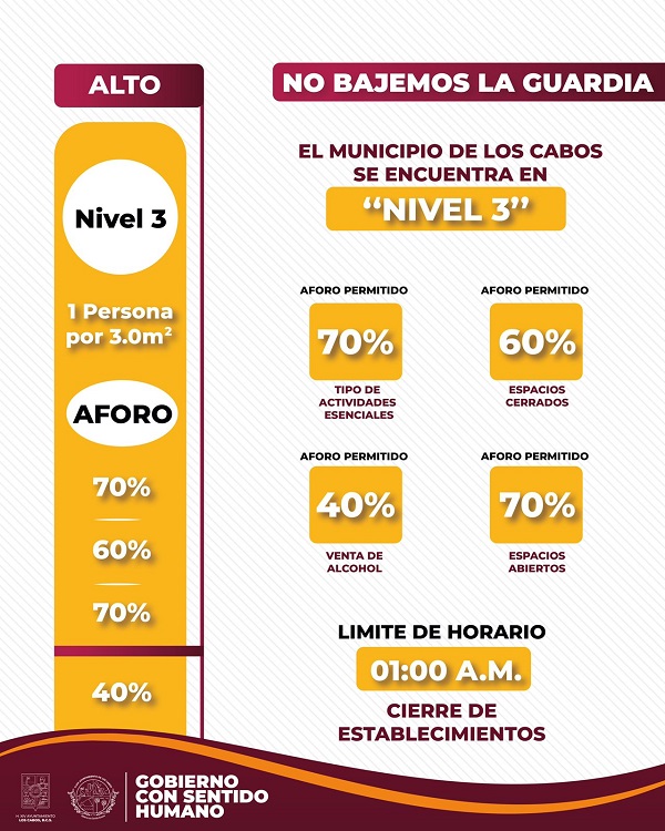 Ante el aumento de los números de contagios de COVID-19 en el municipio, el alcalde Oscar Leggs Castro, -a través de la Dirección Municipal de Salud-, dio a conocer que el Comité Estatal de Seguridad en Salud determinó que Los Cabos se mantiene en el nivel 3, color amarillo, del semáforo del Sistema de Alertas Sanitarias de Baja California Sur, al contar 1 mil 036 casos activos y con 61 casos hospitalizados, -al momento de la redacción-.