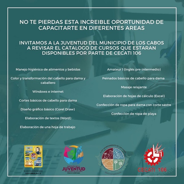 El Instituto de la Juventud del Municipio de Los Cabos (INJUVE), lanzó una convocatoria para becar a jóvenes cabeños que quieran capacitarse en áreas técnicas; los curos serán impartidos por el Centro de Capacitación para el Trabajo Industrial (CECATI #106), ubicado en San José del Cabo, así lo informó el director general del INJUVE, Eduardo Gamaliel Valdéz Ortíz.
