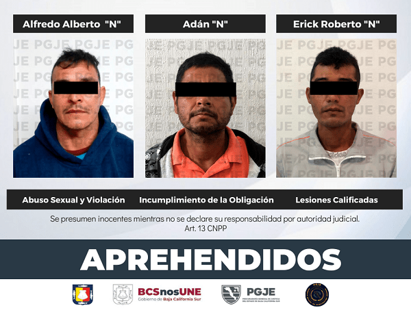 Mediante distintos operativos, la Procuraduría General de Justicia del Estado (PGJE) de Baja California Sur cumplimentó órdenes de aprehensión en contra de tres personas relacionadas con delitos contra la libertad sexual y la familia.