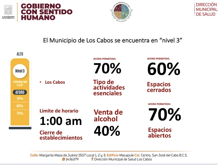 Ante el aumento del número de contagios de COVID-19 en el municipio, el Comité Estatal de Seguridad en Salud determinó que Los Cabos se mantiene en el nivel 3, color amarillo del semáforo del Sistema de Alertas Sanitarias de Baja California Sur, al contar con 46 casos hospitalizados y 2 mil 195 casos activos, -al momento de la redacción-, así lo dio a conocer el director municipal de Salud, Dr. Juan Carlos Costich Perez.